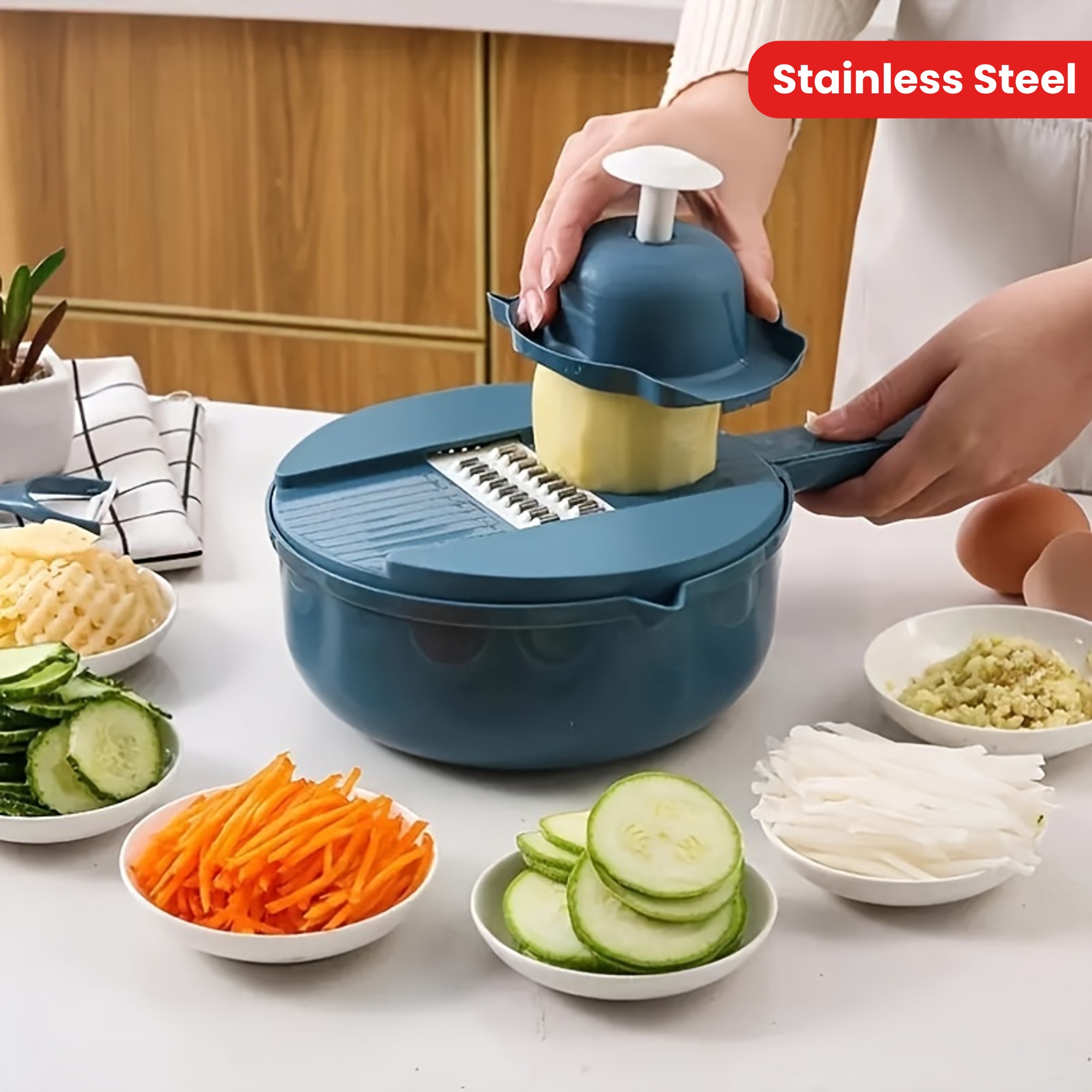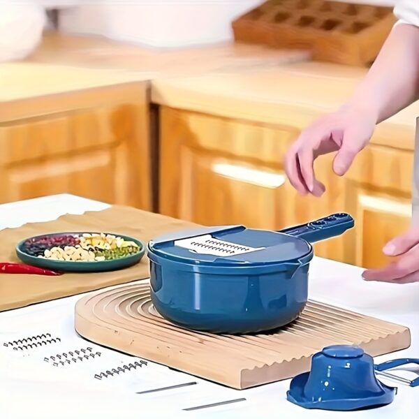 12-in-1 Multifunctional Vegetable Chopper with Container and Hand Guard, 6 Stainless Steel Blades, Blue