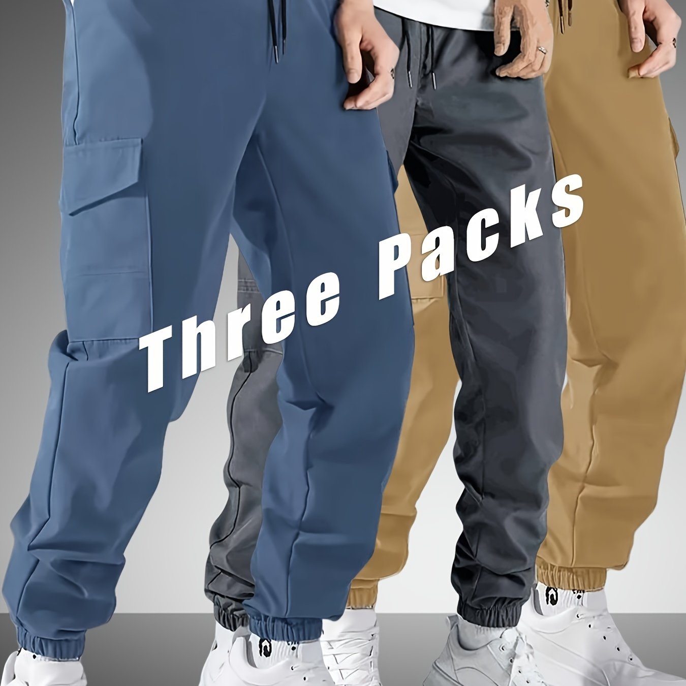 3pcs Men's Multi-Pocket Street Loose Drawstring Pure Color Work Pants