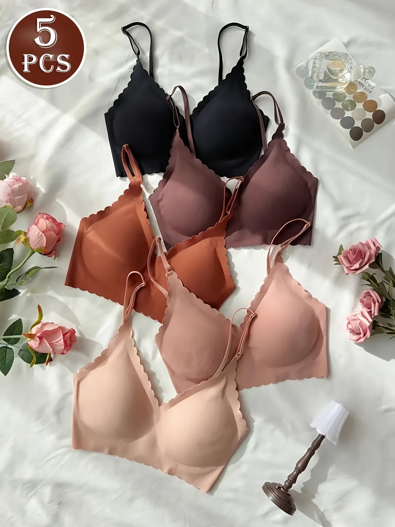 5pcs Seamless Wave Edge Comfort Bralettes for Women – Full Coverage, Wire-Free with Removable Pads, Nylon & Elastane Blend, Hand Washable